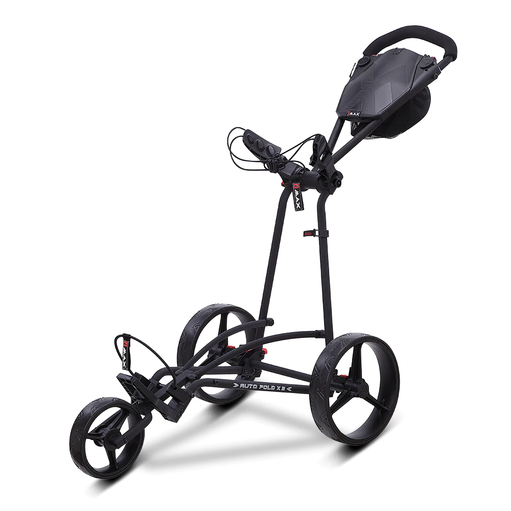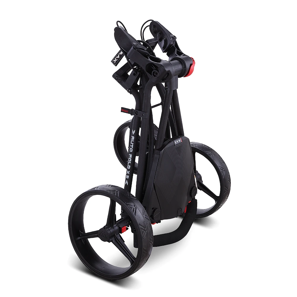Ein einziger Handgriff genügt, um ihn ein- und auszuklappen, wobei sich das Vorderrad automatisch in Position bewegt. Der X2 verfügt über eine einfache, verbesserte untere Taschenhalterung, die die Stabilität für alle Golftaschen auf dem Trolley verbessert.